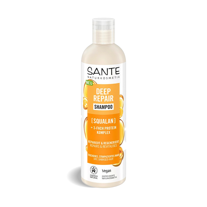 El champĂș Deep Repair contiene una fĂłrmula de cuidado altamente eficaz para cabello seco y dañado con escualeno y un complejo triple de proteĂnas.